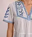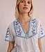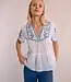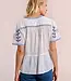 A lightweight short sleeve poplin top, detailed with cross stitch, a Tunisian collar, V-neckline, and ruffled hem. 100% Cotton