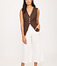 With shell button details and a flattering drop hem, this flattering chocolate-brown vest is great for layering or on its own for a look that's trendy, yet elegant.