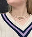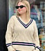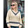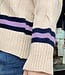 A classic cable knit sweater with some added colour! Try out the Astrid V-Neck cable knit for a warm and cozy sweater. Featuring a navy blue and purple collar and detailing at the bottom.